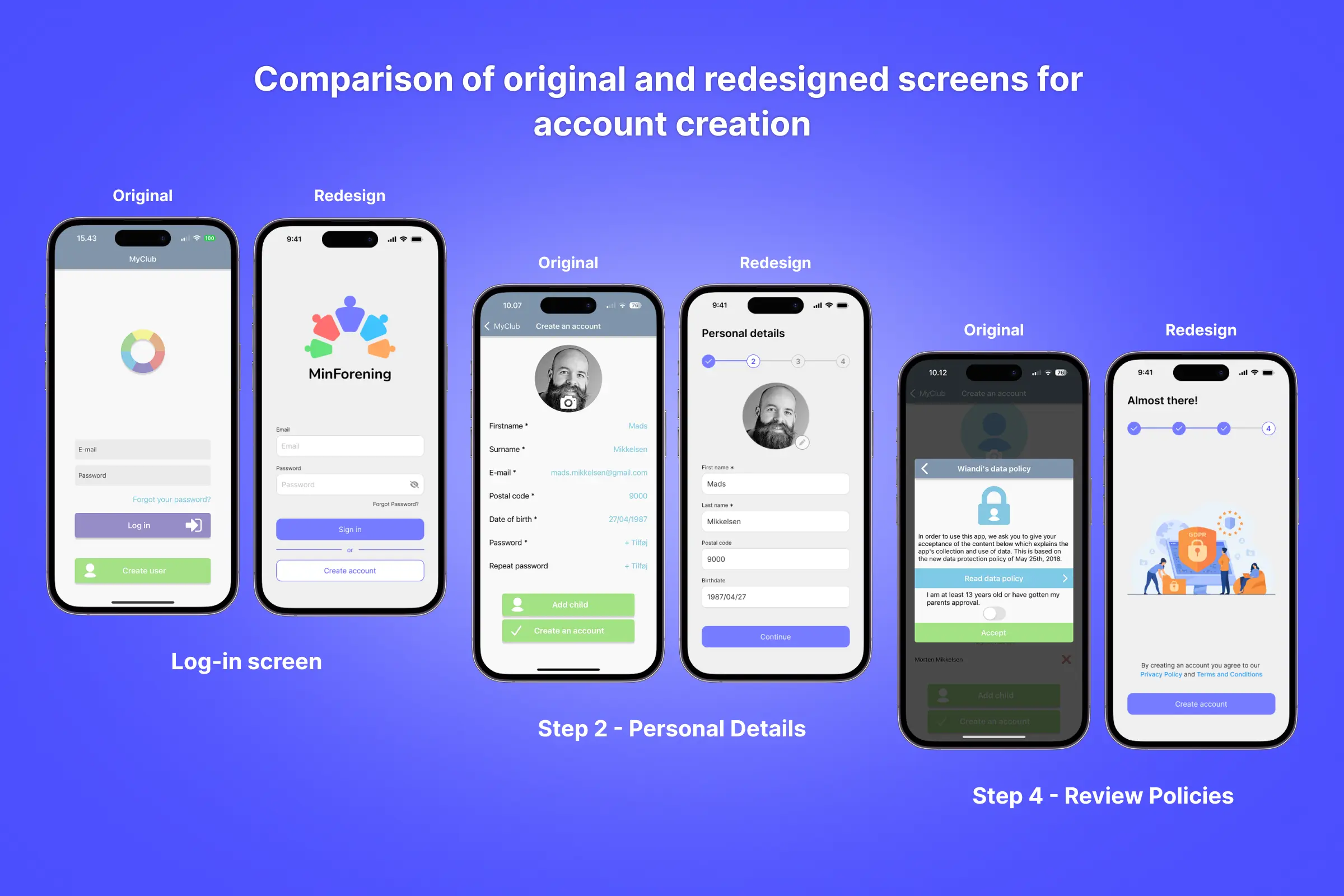 Below is the interactive Figma prototype of the redesigned MinForening app, featuring separated flows for each key interaction such as account creation, home navigation, and club management. The prototype highlights improvements in usability and information architecture, demonstrating how users can efficiently access communications, events, payments, and profile settings within a clearer, more intuitive interface.