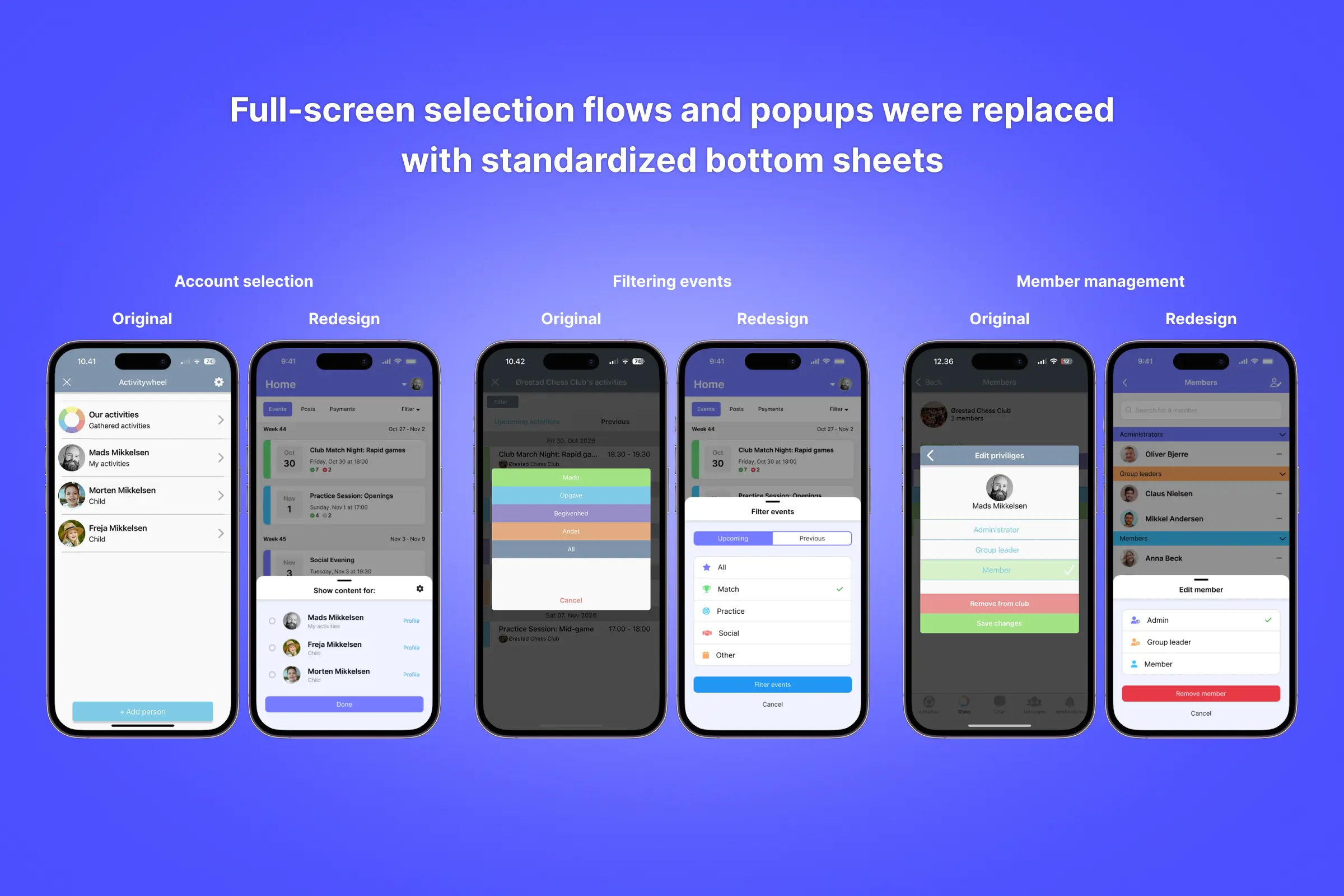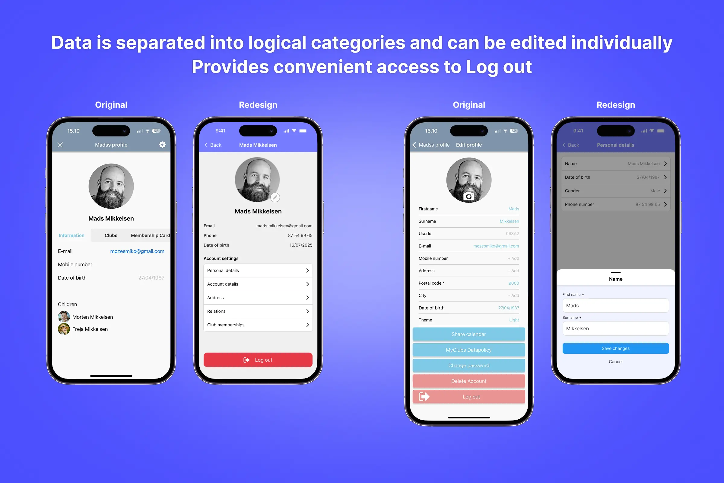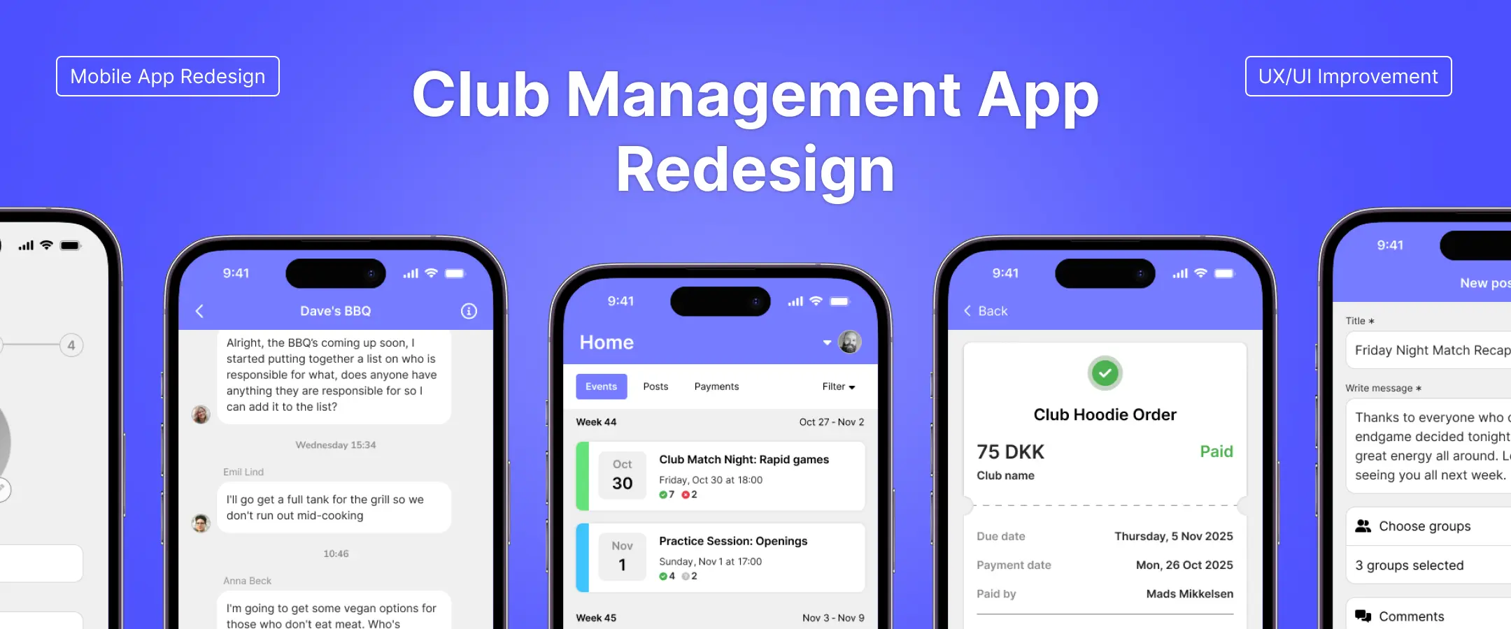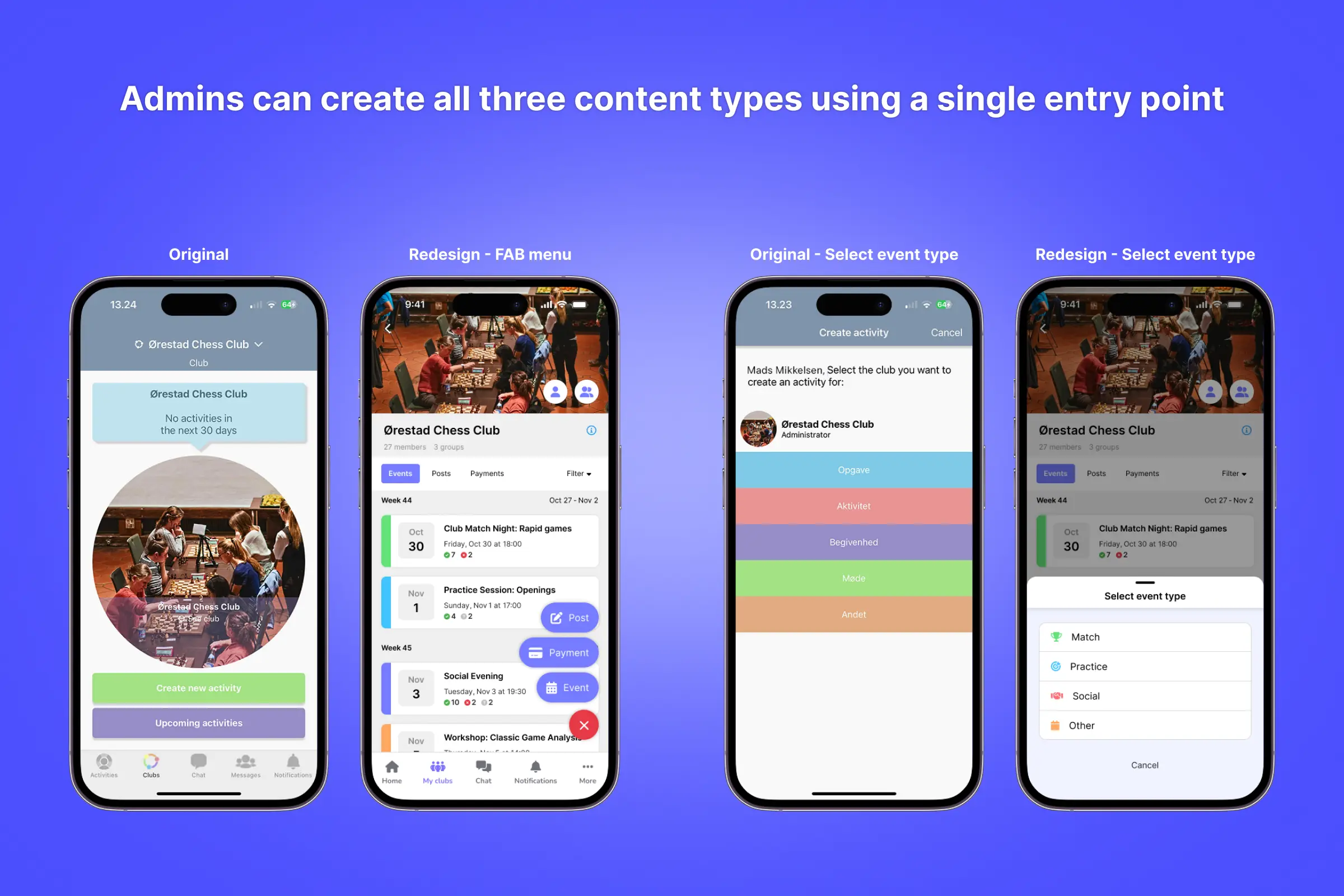 This project involved a full end-to-end redesign of MinForening, a club management application used by administrators and members. The goal was to modernize the experience, streamline core workflows such as event creation, membership handling, and communication, and introduce a clearer information structure. Through research, flow restructuring, and a complete UI overhaul, the new design improves usability, improves communication, and supports a more scalable product foundation. Throughout the case study, selected screenshots and before-and-after comparisons illustrate how core workflows and interface elements were improved in the redesign.