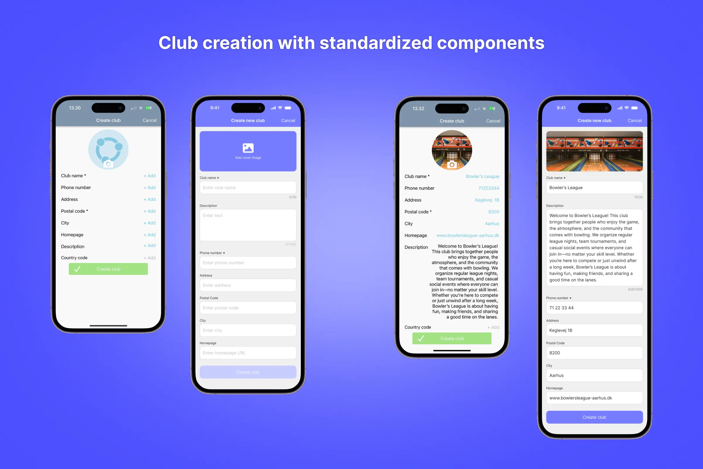 The club creation process was improved by replacing non-standard input fields with standardized components used throughout the redesign. A visual update across the app included consistent use of elliptical user profile pictures and square club cover images. Since club pages display the cover image as a header, the creation flow now shows this image in full, providing a clear preview during setup.