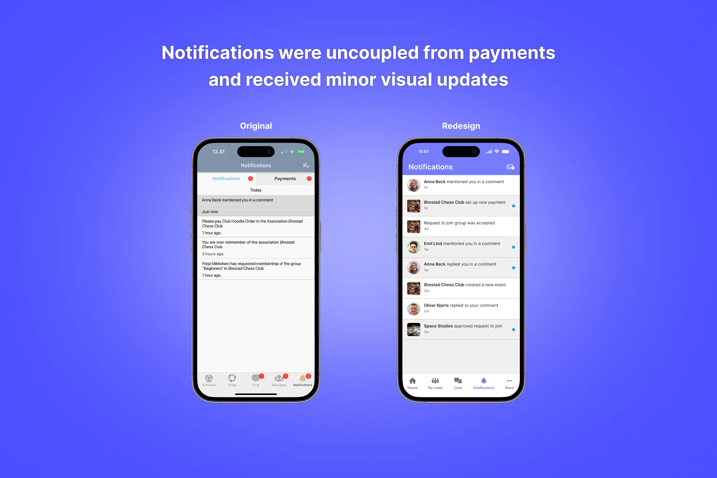 The notification system remains largely unchanged, except for uncoupling notifications from payments to clarify context. Each notification now includes an image representing the relevant user or club, improving clarity and visual recognition.