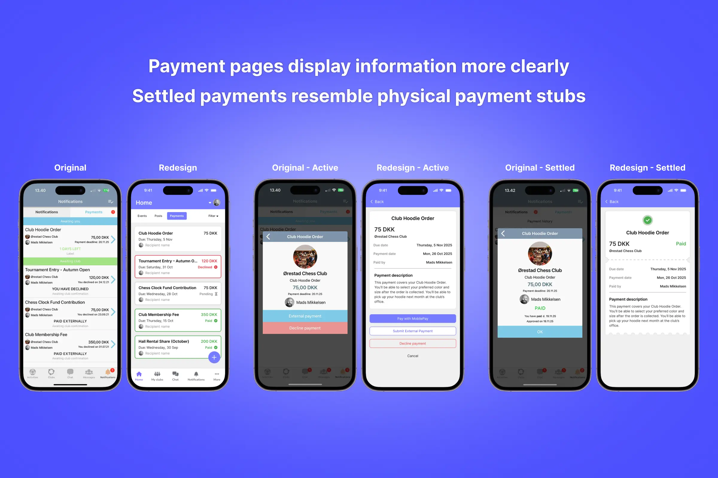 The existing club page had limited functionality, showing only basic club details. The redesign consolidates all club-related events, communications, payments, and detailed club and user information into a holistic view. This approach improves communication within the app and makes it easier for users to find club-specific content.
