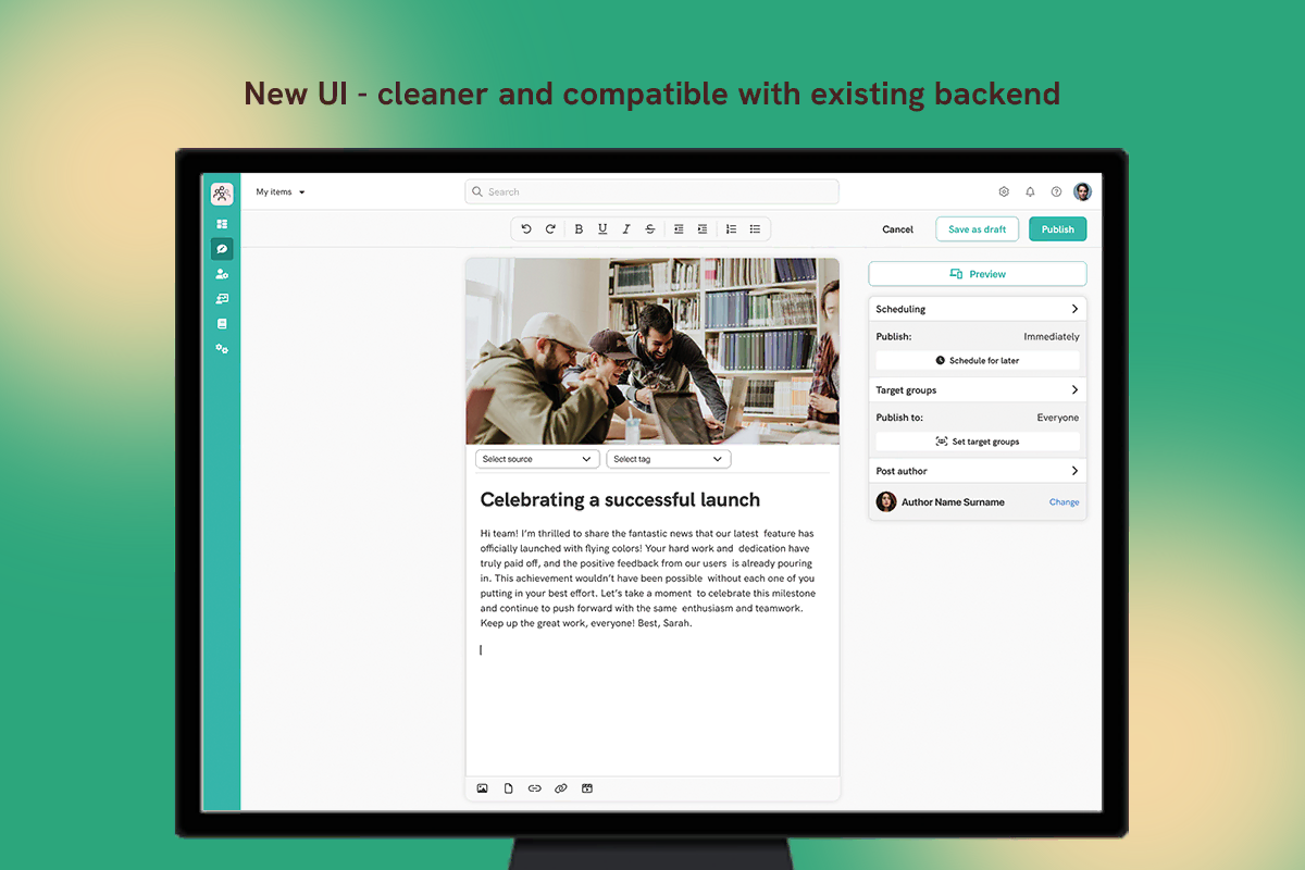 We introduced a single rich-text editor as the core element, with inline options to add media, embeds, and links. Content settings were redesigned into a collapsible panel, accessible but out of the way.