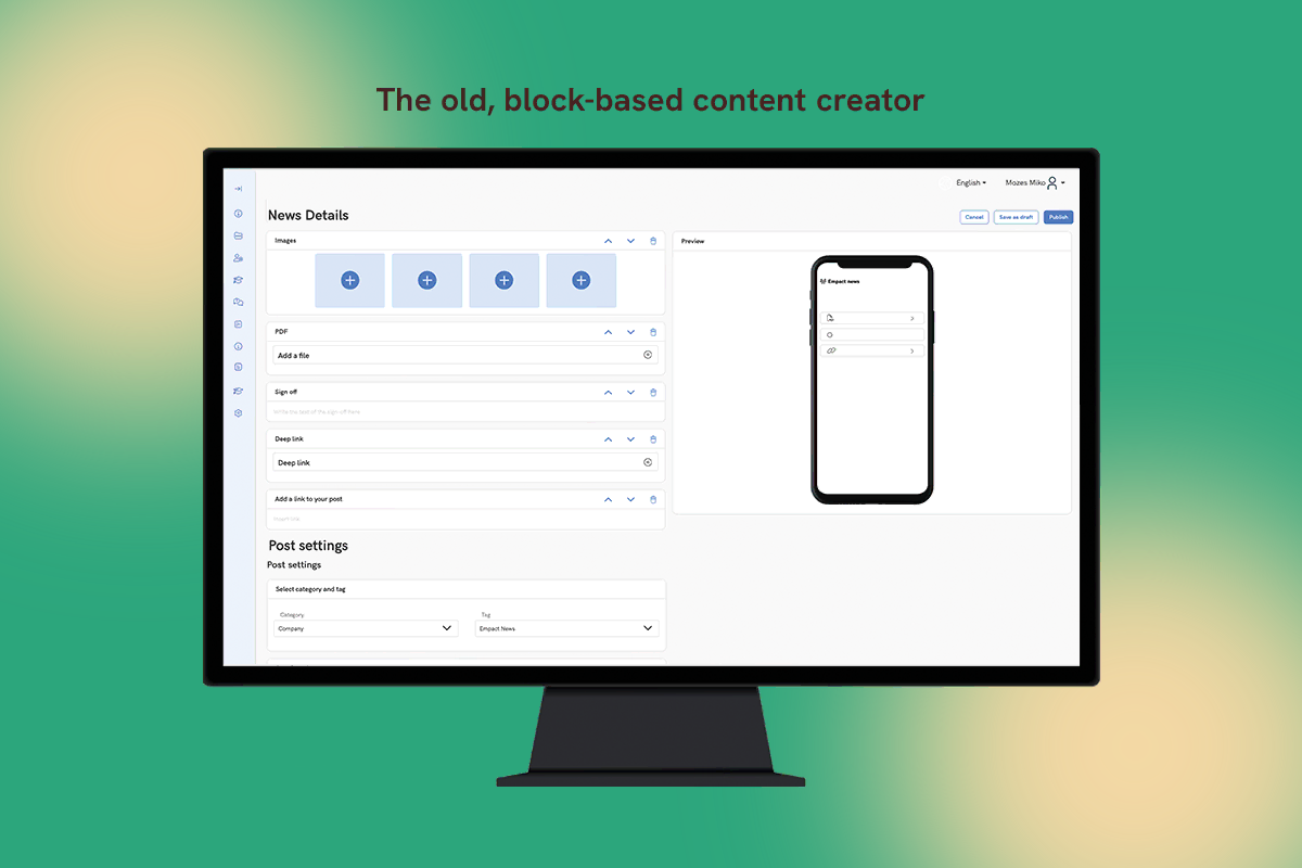 The existing content creator was built around content “blocks,” forcing users to manually piece together different types of elements—paragraphs, images, links—in a rigid order. Combined with a clunky file manager, this led to frustration and reduced productivity.