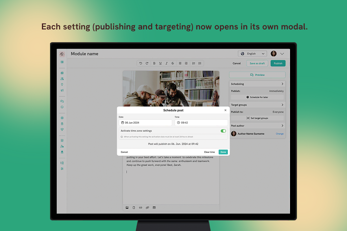 Options like post scheduling, expiration, and audience targeting were poorly placed and often misunderstood. Users frequently missed or misconfigured them.