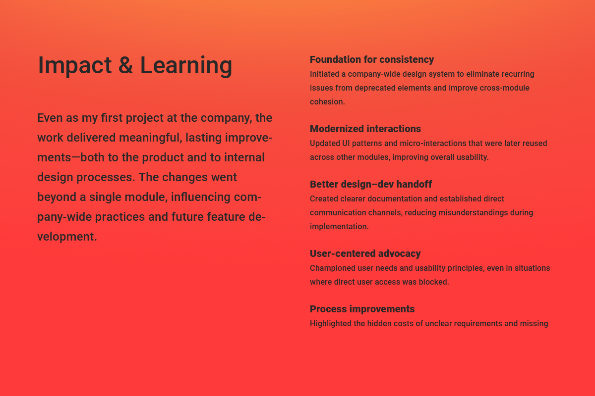 The challenges I faced during this project ended up being a push for lasting change. I called attention to inefficiencies like unclear requirements, limited user access, and outdated components, and pushed for better ways of working. It set the stage for more structure, stronger collaboration, and a focus on user needs that carried over into future projects.