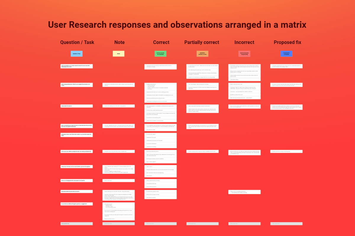 All responses, notes, and observations gathered during user testing were arranged in a matrix to help visualize the usability and state of the MVP. This helped get an easier overview as to which aspect of the user flows needed to be addressed.