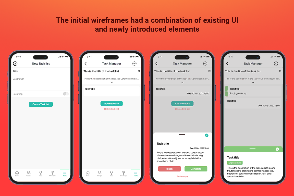 Since the Task Management module was a big depearture from the current content of our app, it became clear that existing UI elements and interaction patterns will not be sufficient in the long run. This prompted a key conversation with developers and project management: could we introduce new patterns? I argued for modern interaction design—bottom sheets for quick content previews, floating action buttons for task creation, and gesture-based task completion. These improvements were approved after discussion, and I refined the wireframes accordingly.